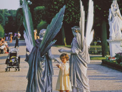 Too curious about people, the angel has accidentally fallen into our world. Unable to fly in an atmosphere too heavy with the sorrow of people, the angel slowly treads the earth, hoping to bring enough joy and lightness to make flight possible once more.