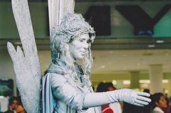 An angel, two metre high wings, silver, glitter, stillness, and clowning, are woven together to create the ethereal magic of Angelic.